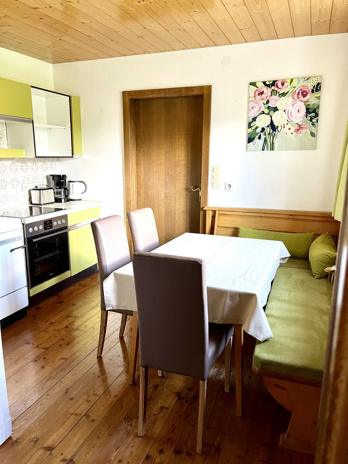 The kitchen is furnished with a a kitchen unit (refrigerator, stove, oven, sink, dishwasher, extractor fan, dishwasher, kelle, coffee machine, dishes and cutlery) and a sitting area.